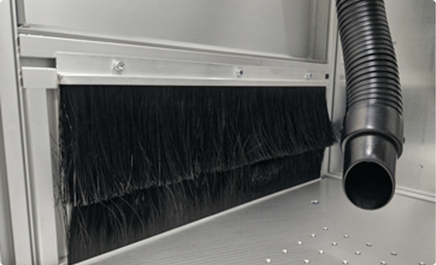 Long workpieces in particular are difficult to position and process in many laser cabins. With the LMF „Pro“ XL800, the optional side pass-through allows for convenient feeding, so that components can be optimally aligned and precisely marked through the lateral brush curtain.